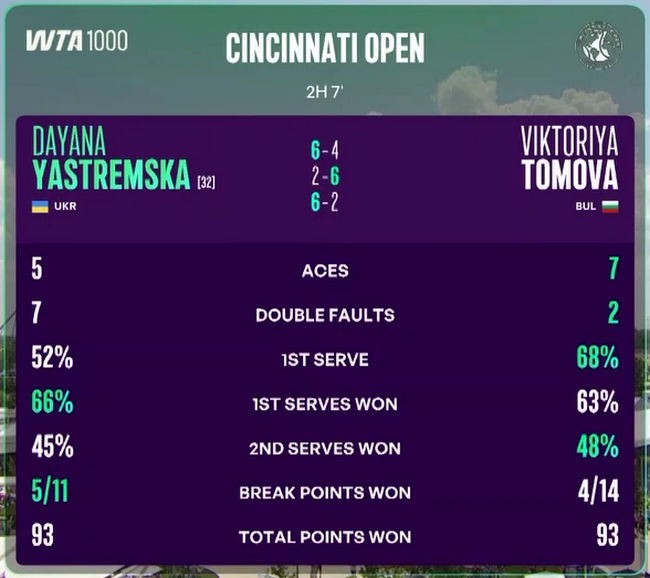 ![]() Cincinnati Open - WTA 1000 Цинциннати, США • 7-18 августа • хард • $5,152,599 Действующая чемпионка: Арина Соболенко (-) Сетки турнира: квалификация • одиночный разряд • парный разряд Второй круг Даяна Ястремская (Украина, 32) - Виктория Томова (Болгария, Q) 6:4, 2:6, 6:2 Ястремская пятый раз выступает на турнире в Цинциннати и впервые дошла до третьего раунда. По ходу сегодняшней встречи украинка выполнила пять эйсов, допустив семь двойных ошибок, реализовала 5 из 11 брейк-поинтов и проиграла четыре гейма на своей подаче. Следующая соперница Ястремской определится в матче Ван Синьюй (Китай) - Коко Гауфф (США, 2). Обсуждение матча в нашем теннисном чате в Telegram