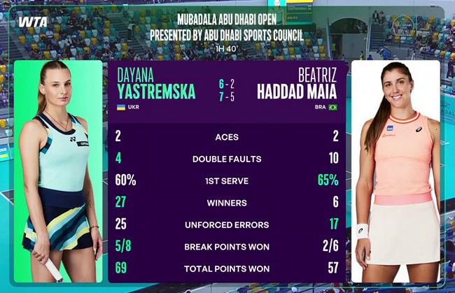 ![]() Mubadala Abu Dhabi Open - WTA 500 Абу-Даби, ОАЭ • 1-7 февраля • хард • $1,206,446 Действующая чемпионка: Белинда Бенчич (Швейцария) Сетки турнира: квалификация • одиночный разряд • парный разряд Первый круг Даяна Ястремская (Украина) - Беатрис Аддад Мая (Бразилия) Украинская теннисистка сыграла шестой матч в этом сезоне и прервала серию из трех поражений. Ястремская впервые за два участия в Абу-Даби вышла во второй круг. Три года назад она преодолела квалификацию и затем проиграла в первом круге. Следующей соперницей Даяны на турнире в ОАЭ будет Екатерина Александрова (-, 2). Теннисистки ранее трижды встречались в рамках Тура, и одну победу одержала Ястремская. В прошлом сезоне украинка уступила Александровой в финале турнира WTA 500 в Линце. Подписывайтесь на наш Telegram-канал UKRAINIAN TENNIS, чтобы не пропустить трансляции матчей с участием украинских игроков