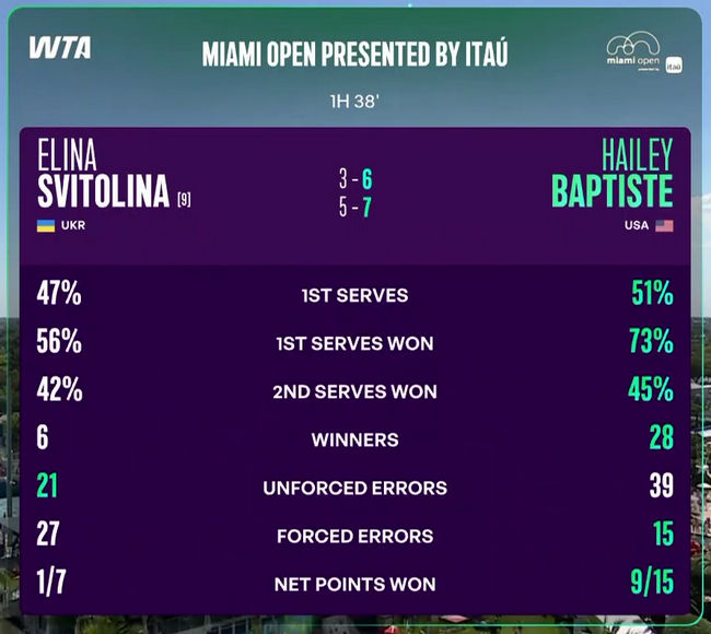 Майами. Свитолина уступила Баптист и не смогла выйти в 1/8 финалаНовости![]() Miami Open - WTA 1000 Майами, США • 17-29 марта • хард • $9,415,725 Действующая чемпионка: Арина Соболенко (-) Сетки турнира: квалификация • одиночный разряд • парный разряд Третий круг Элина Свитолина (Украина, 9) - Хейли Баптист (США) Украинская теннисистка во второй раз встретилась с американкой. В прошлом году Свитолина победила Баптист в третьем круге грунтового турнира WTA 1000 в Риме. Тогда противостояние завершилось в трех сетах. Сегодня Элина сыграла 25-й матч в сезоне и потерпела лишь пятое поражение. На данный момент она является единственной теннисисткой в Туре в этом году, которая достигла показателя в 20 побед. Также украинке не удалось продлить свою беспроигрышную серию против соперниц, не входящих в топ-40, которая составляла 13 матчей. Подписывайтесь на наш Telegram-канал UKRAINIAN TENNIS, чтобы не пропустить трансляции матчей с участием украинских игроков ![]() |