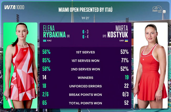 Майами. Костюк на втором подряд турнире проиграла Рыбакиной и выбыла из борьбыНовости![]() Miami Open - WTA 1000 Майами, США • 17-29 марта • хард • $9,415,725 Действующая чемпионка: Арина Соболенко (-) Сетки турнира: квалификация • одиночный разряд • парный разряд Третий круг Марта Костюк (Украина, 27) - Елена Рыбакина (Казахстан, 3) 3:6, 4:6 Украинка в шестой раз сыграла против Рыбакиной и потерпела пятое поражение. Напомним, что две недели назад теннисистки встречались на этой же стадии турнира WTA 1000 в Индиан-Уэллс, где также победила казахстанка. Костюк не удалось повторить свой лучший результат в Майами, который она показала в прошлом году. Тогда она дошла до четвертого круга, в котором уступила будущей участнице финала Джессике Пегуле. В этом году Марта Костюк сыграла четыре матча против соперниц, входящих в топ-5 рейтинга, и одержала одну победу. Подписывайтесь на наш Telegram-канал UKRAINIAN TENNIS, чтобы не пропустить трансляции матчей с участием украинских игроков