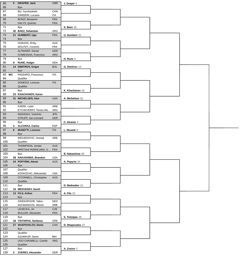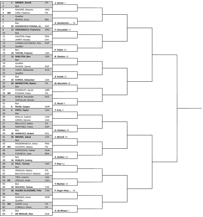 Результаты жеребьевки турнира ATP 1000 в Риме![]() Internazionali BNL d’Italia - ATP Masters 1000 Рим, Италия • 7-18 мая • грунт • €9,645,265 Действующий чемпион: Александр Зверев (Германия) Сетки турнира: квалификация • одиночный разряд • парный разряд • Теннисный турнир в Риме был основан в 1930 году. Первые пять лет соревнования проводились в Милане, после чего переехали в Рим. С 1990 года турнир относится к высшей категории АТР 1000. Игры проходят на открытых грунтовых кортах комплекса Foro Italico. • Игры основной сетки стартуют в среду 7 мая. Финальные поединки в одиночном и парном разрядах состоятся в воскресенье 18 мая. • Официальный мяч турнира - Dunlop ATP Clay. • Рафаэль Надаль является рекордсменом турнира по количеству завоеванных титулов - 10 (2005-2007, 2009, 2010, 2012, 2013, 2018, 2019, 2021) • Из чемпионов прошлых лет в этом сезоне в Риме сыграют только Александр Зверев (2017, 2024) и Даниил Медведев (2023). • Итальянские теннисисты не побеждали в Риме с 1976 года, когда чемпионом соревнований стал Адриано Панатта, а последним кому удалось защитить титул на этих соревнованиях был испанец Рафаэль Надаль в 2018-2019 годах. Одиночный разряд Wild Card от организаторов получили: Фабио Фоньини (Италия) Маттео Джиганте (Италия) Федерико Чина (Италия) Лука Нарди (Италия) Франческо Пассаро (Италия) ТОП-8 сеяных и их соперники во втором круге: 1. Янник Синнер (Италия) - Мариано Навоне (Аргентина)/Федерико Чина (Италия) 2. Александр Зверев (Германия) - Камилло Уго Карабелли (Аргентина)/"квалифаер" 3. Карлос Алькарас (Испания) - Ёсихито Нисиока (Япония)/Ян-Леннард Штруфф (Германия) 4. Тэйлор Фритц (США) - Габриэль Диалло (Канада)/Маркос Гирон (США) 5. Джек Дрэйпер (Великобритания) - Бу Юньчаокэтэ (Китай)/Лучано Дардери (Италия) 6. Каспер Рууд (Норвегия) - Александр Бублик (Казахстан)/Роман Сафиуллин (-) 7. Алекс де Минор (Австралия) - Лука Нарди (Италия)/Флавио Коболли (Италия) 8. Лоренцо Музетти (Италия) - Хамад Меджедович (Сербия)/"квалифаер" Очки и призовые: R1: 10 очков / €20,820 R2: 30 очков / €30,895 R3: 50 очков / €52,925 R4: 100 очков / €90,445 QF: 200 очков / €165,670 SF: 400 очков / €291,040 FR: 650 очков / €523,870 W: 1000 очков / €985,030 ![]() ![]() Парный разряд *Ожидается ТОП-4 сеяных и их соперники в первом круге: *Ожидается Очки и призовые (на пару): R1: 0 очков / €16,690 R2: 90 очков / €30,540 QF: 180 очков / €56,950 SF: 360 очков / €113,880 FR: 600 очков / €212,060 W: 1000 очков / €400,560 |
