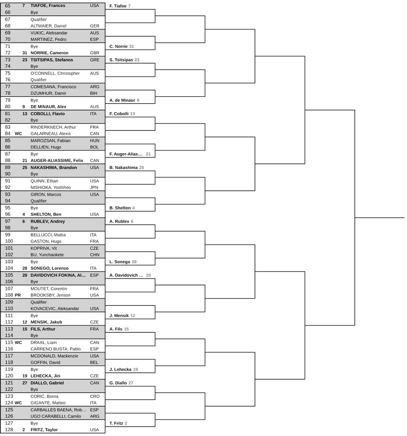 Результаты жеребьевки турнира ATP 1000 в Торонто![]() National Bank Open Presented by Rogers - ATP Masters 1000 Торонто, Канада • 27 июля - 7 августа • хард • $10,913,715 Действующий чемпион: Алексей Попырин (Австралия) Сетки турнира: квалификация • одиночный разряд • парный разряд • Открытый чемпионат Канады с 2011 года проходит для мужчин и женщин в одну неделю, чередуясь каждый сезон между двумя городами - Торонто и Монреалем. Мужские соревнования пройдут в этом году в 135-й раз (впервые в 1881 году). В Торонто матчи проходят на открытых хардовых кортах комплекса Sobeys Stadium. • Игры основной сетки стартуют в понедельник 27 июля. Финальные матч в одиночном и парном разрядах состоятся в четверг 7 августа. • Официальный мяч турнира - Wilson US Open. • В прошлом году чемпионом турнира, который игрался в Монреале, стал австралиец Алексей Попырин. Титул в парном разряде выиграли Марсель Гранольерс (Испания) и Орасио Себальос (Аргентина). • Рекордсменом турнира по количеству титулов является чех Иван Лендл, который побеждал на этих соревнованиях шесть раз. С 1990 года, когда турнир получил категорию "Мастерс", чаще всех его выигрывал испанец Рафаэль Надаль (5 титулов). • Из чемпионов прошлых лет в этом сезоне в Монреале сыграют: Алексей Попырин (2024), Пабло Карреньо-Буста (2022), Даниил Медведев (2021) и Александр Зверев (2017). • Ни одному теннисисту не удавалось защитить свой титул на "Мастерсе" в Канаде, после Рафаэля Надаля в 2018-2019 годах. Одиночный разряд Wild Card от организаторов получили: Лиам Драксль (Канада) Вашек Поспишил (Канада) Николас Арсено (Канада) Алексис Галарно (Канада) Маттео Джиганте (Италия) Игроки топ-30 снявшиеся с турнира №1 Янник Синнер (Италия) - травма локтя №2 Карлос Алькарас (Испания) - усталость №5 Джек Дрэйпер (Великобритания) - травма левой руки №6 Новак Джокович (Сербия) - травма паха №15 Томми Пол (США) - травма мышц живота №20 Григор Димитров (Болгария) - травма грудной клетки №30 Александр Бублик (Казахастан) - изменение расписания ТОП-8 сеяных и их соперники во втором круге (первый раунд пропускают): 1. Александр Зверев (Германия) - Адам Уолтон (Австралия) / Бенжамен Бонзи (Франция) 2. Тэйлор Фритц (США) - Камило Уго Карабелли (Аргентина) / Роберто Карбальес Баэна (Испания) 3. Лоренцо Музетти (Италия) - Шан Цзюнчэнь (Китай) / "квалифаер" 4. Бен Шелтон (США) - Маркос Гирон (США) / "квалифаер" 5. Хольгер Руне (Дания) - Джованни Мпетши Перрикар (Франция) / "квалифаер" 6. Андрей Рублев (-) - Маттиа Беллучи (Италия) / Уго Гастон (Франция) 7. Фрэнсис Тиафо (США) - Даниэль Альтмайер (Германия) / "квалифаер" 8. Каспер Рууд (Норвегия) - Роман Сафиуллин (-) / "квалифаер" Очки и призовые: R1: 10 очков / $23 760 R2: 30 очков / $35 260 R3: 50 очков / $60 400 R4: 100 очков / $103 225 QF: 200 очков / $189 075 SF: 400 очков / $332 160 FR: 650 очков / $597 890 W: 1000 очков / $1 124 360 ![]() ![]() Парный разряд *ожидается |