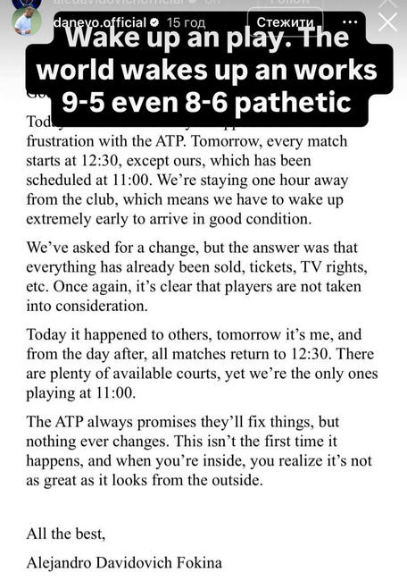 ![]() Алехандро Давидович Фокина, занимающий 19-е место в рейтинге, должен был сыграть сегодня свой матч против чеха Якуба Меншика первым запуском в 11 утра. В то же время все остальные сегодняшние поединки на турнире начинались в 12:30. Испанец выразил свое недовольство через Instagram, обратившись к ATP. "Мы остановились в часе езды от клуба, поэтому приходится просыпаться очень рано, чтобы прибыть на корт в хорошем состоянии. Опять очевидно, что о игроках не думают вообще. ATP всегда обещает, что решит эти проблемы, но ничего не меняется", – написал испанец. Он также добавил: "Это не первый случай, и когда ты внутри тура, понимаешь, что все выглядит не так прекрасно, как кажется снаружи". Британец Даниэл Эванс ответил испанцу через Instagram, репостнув его заявление и оставив короткий комментарий: "Проснись и играй. Мир просыпается и работает с 9:00 до 17:00, а иногда с 8:00 до 18:00. Жалкий». Отметим, что Давидович Фокина сегодня победил Якуба Меншика (6:2, 6:4), затратив на свою победу 76 минут игрового времени.