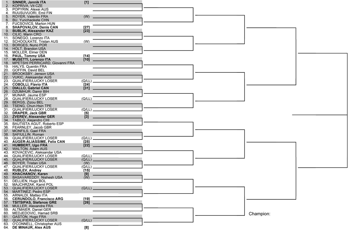 Помимо Синнера, из чемпионов прошлых лет также выступят: Новак Джокович (2011, 2015, 2018, 2023), Карлос Алькарас (2022), Даниил Медведев (2021) и Марин Чилич (2014).