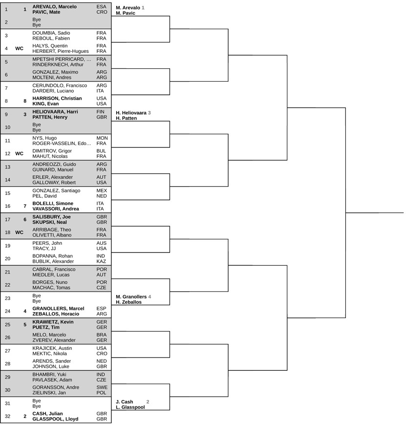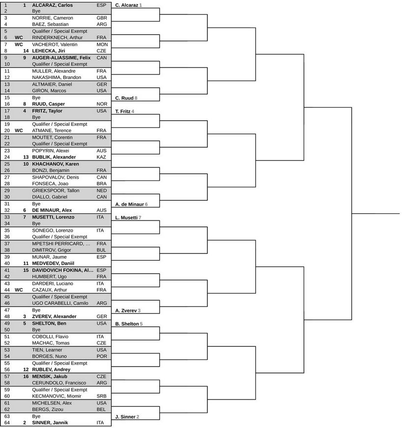 Результаты жеребьевки турнира ATP 1000 в Париже![]() Rolex Paris Masters - ATP Masters 1000 Париж, Франция • 27 октября - 2 ноября • хард (зал) • €7,703,855 Действующий чемпион: Александр Зверев (Германия) Сетки турнира: квалификация • одиночный разряд • парный разряд • Теннисный турнир в Париже проводится с 1969 года, а с 1990 года относится к главной серии АТР-тура - "Мастерс". В этом году состоится 53-й розыгрыш турнира. • С этого года матчи будут проводится на закрытых хардовых кортах многофункционального комплекса La Défense Arena. • Игры основной сетки стартуют в понедельник 27 октября. Финальные матчи в одиночном и парном разрядах состоятся в воскресенье 2 ноября. • Время турнира: разница с Киевом составляет -1 час. • Официальный мяч турнира - Head Tour XT. • В прошлом году чемпионом турнира стал немецкий теннисист Александр Зверев. Титул в парном разряде выиграли Уэсли Коольхоф (Нидерланды) и Никола Мектич (Хорватия). • В 1993 году в финале турнире в Париже сыграл украинец Андрей Медведев. В решающем поединке Медведев уступил хорвату Горану Иванишевичу. • Рекордсменом турнира по количеству титулов является серб Новак Джокович, побеждавший на этих кортах 7 раз. Он также единственный, кто выигрывал этот турнир три раза подряд: с 2013 по 2015 года. С того момента, ни одному теннисисту не удалось защитить свой титул на этих соревнованиях. • Из чемпионов прошлых лет в этом сезоне в Шанхае сыграют: Александр Зверев (2025), Даниил Медведев (2020) и Карен Хачанов (2018). Одиночный разряд Wild Card от организаторов получили: Теренс Атман (Франция) Артур Риндеркнеш (Франция) Валентен Вашеро (Монако) Артур Казо (Франция) ТОП-8 сеяных и их соперники во втором круге (первый раунд пропускают): 1. Карлос Алькарас (Испания) - Кэмерон Норри (Великобритания) или Себастиан Баэс (Аргентина) 2. Янник Синнер (Италия) - Алекс Микельсен (США) или Зизу Бергс (Бельгия) 3. Александр Зверев (Германия) - Камило Уго Карабелли (Аргентина) или "квалифаер" 4. Тэйлор Фритц (США) - Теренс Атман (Франция) или "квалифаер" 5. Бен Шелтон (США) - Флавио Коболли (Италия) или Томаш Махач (Чехия) 6. Алекс де Минор (Австралия) - Таллон Грикспор (Нидерланды) или Габриэль Диалло (Канада) 7. Лоренцо Музетти (Италия) - Лоренцо Сонего (Италия) или" квалифаер" 8. Каспер Рууд (Норвегия) - Маркос Гирон (Франция) или Даниэль Альтмайер (Германия) Очки и призовые: R1: 10 очков / €24,500 R2: 50 очков / €44,220 R3: 100 очков / €82,465 QF: 200 очков / €154,170 SF: 400 очков / €282,650 FR: 650 очков / €516,925 W: 1000 очков / €946,610 ![]() Парный разряд Wild Card от организаторов получили: Кантен Алис/Пьер-Юг Эрбер (Франция) Григор Димитров/Николя Маю (Болгария/Франция) Тео Аррибаж/Альбано Оливетти (Франция) ТОП-4 сеяных и их соперники во втором круге (первый раунд пропускают): 1. Марсело Аревало/Мате Павич (Сальвадор/Хорватия) - Садио Думбия/Фабьен Ребуль (Франция) или Кантен Алис/Пьер-Юг Эрбер (Франция) 2. Джулиан Кэш/Ллойд Гласспул (Великобритания) - Юки Бхамбри/Адам Павлашек (Индия/Чехия) или Андре Горанссон/Ян Зелинский (Швеция/Польша) 3. Харри Хелиоваара/Генри Паттен (Финляндия/Великобритания) - Уго Нис/Эдуард Роже-Васслен (Монако/Франция) или Григор Димитров/Николя Маю (Болгария/Франция) 4. Марсель Гранольерс/Орасио Себальос (Испания/Аргентина) - Франсишку Кабрал/Лукас Миедлер (Португалия/Австрия) или Нуну Боржеш/Томаш Махач (Португалия/Чехия) Очки и призовые: R1: 0 очков / €14,350 R2: 90 очков / €26,275 QF: 180 очков / €47,810 SF: 360 очков / €86,660 FR: 600 очков / €157