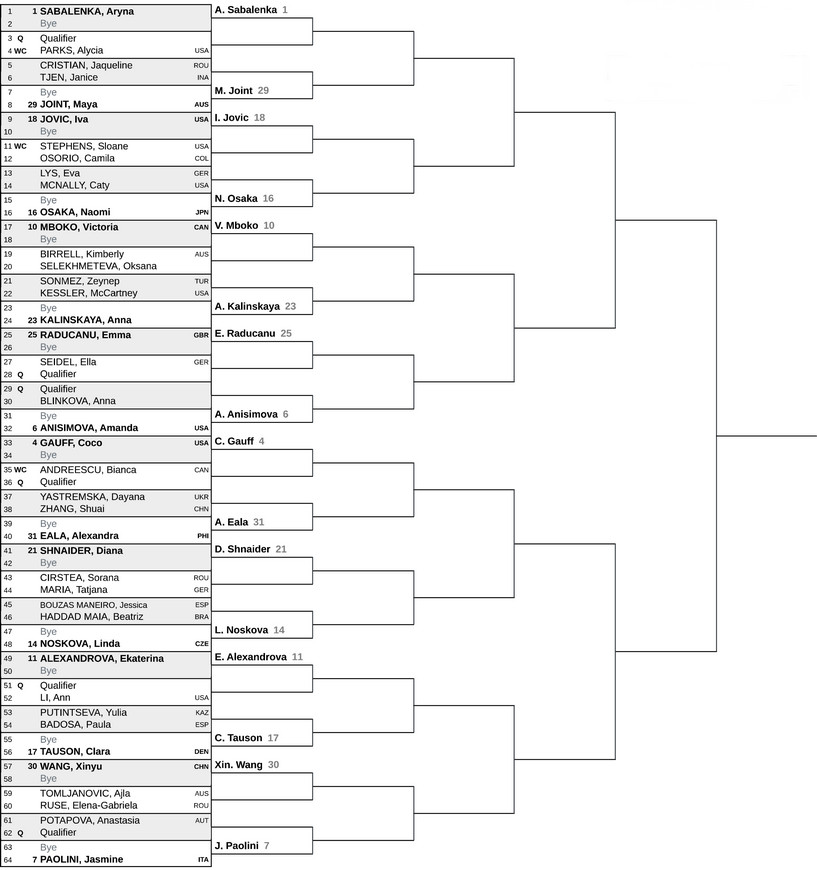 Результаты жеребьевки на турнире WTA 1000 в США![]() BNP Paribas Open - WTA 1000 Индиан-Уэллс, США • 4-15 марта • хард • $9,415,725 Действующая чемпионка: Мирра Андреева (-) Сетки турнира: квалификация • одиночный разряд • парный разряд • Женский турнир в Индиан-Уэллс проводится с 1989 года, и в этом году состоится в 37-й раз. С 2009 года соревнования относятся к категории Premier Mandatory, а с 2021 - WTA 1000. • Матчи турнира проходят на открытых хардовых кортах комплекса Indian Wells Tennis Garden. • Официальный мяч турнира - Dunlop Grand Prix. • Игры основной сетки стартуют во вторник 5 марта. Финальные матчи в одиночном и парном разрядах состоятся в субботу - 15 марта. • Время турнира: разница во времени с Киевом составляет -10 часов. • В прошлом году чемпионкой турнира стала Мирра Андреева (-). Парный титул выиграли Эйша Мухаммад (США) и Деми Схюрс (Нидерланды). • Ни одной теннисистке не удавалось выиграть титул в Индиан-Уэллс более двух раз. Дважды на этом турнире побеждали: Мартина Навратилова (США), Мэри-Джо Фернандес (США), Штеффи Граф (Германия), Линдсей Дэвенпорт (США), Серена Уильямс (США), Даниэла Хантухова (Словакия), Ким Клейстерс (Бельгия), Мария Шарапова (-), Виктория Азаренко (-), Ига Швёнтек (Польша). • Только Мартина Навратилова сумела защитить титул на этом турнире (1990-1991). • Из чемпионок прошлых лет в этом сезоне в Индиан-Уэллс выступят: Мирра Андреева (2025), Ига Швёнтек (2022 и 2024), Елена Рыбакина (2023), Паула Бадоса (2021), Наоми Осака (2018) и Виктория Азаренко (2012, 2016). • Украину в Индиан-Уэллс представят: Элина Свитолина, Марта Костюк и Даяна Ястремская. Одиночный разряд Wild card от организаторов получили: Бьянка Андрееску (Канада) Дженнифер Брэйди (США) Алиша Паркс (США) Слоан Стивенс (США) Лилли Таггер (Австрия) Донна Векич (Хорватия) Кэти Волынец (США) Винус Уильямс (США) ТОП-8 сеяных и их возможные соперницы во втором круге: 1. Арина Соболенко (-) - Алиша Паркс (США) или "квалифаер" 2. Ига Швёнтек (Польша) - Франческа Джонс (Великобритания) или "квалифаер" 3. Елена Рыбакина (Казахстан) - Эмилиана Аранго (Колумбия) или Хейли Баптист (США) 4. Коко Гауфф (США) - Бьянка Андрееску (Канада) или "квалифаер" 5. Джессика Пегула (США) - Донна Векич (Хорватия) или Тереза Валентова (Чехия) 6. Аманда Анисимова (США) - Анна Блинкова (-) или "квалифаер" 7. Жасмин Паолини (Италия) - Анастасия Потапова (Австрия) или "квалифаер" 8. Мирра Андреева (-) - Пэйтон Стернс (США) или Солана Сиэрра (Аргентина) R1: 10 очков / $24,335 R2: 35 очков / $36,110 R3: 65 очков / $61,865 R4: 120 очков / $105,720 QF: 215 очков / $193,645 SF: 390 очков / $340,190 FR: 650 очков / $612,340 W: 1000 очков / $1,151,380 ![]() ![]() Парный разряд ожидается* |