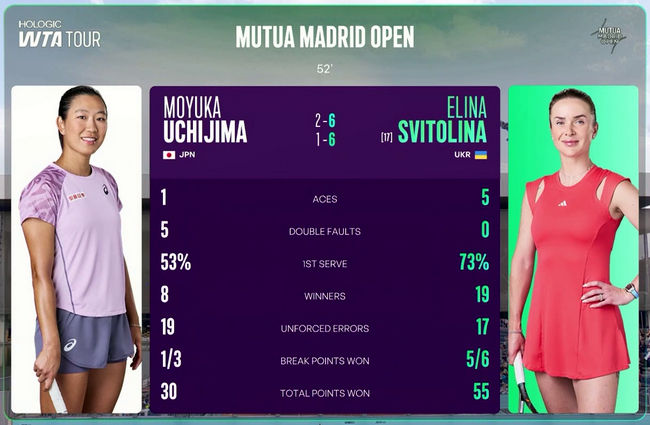Мадрид. Свитолина разгромила Утидзиму в четвертьфинале и продлила свою беспроигрышную сериюНовости![]() Mutua Madrid Open - WTA 1000 Мадрид, Испания • 22 апреля - 4 мая • грунт • $8,963,700 Действующая чемпионка: Ига Швёнтек (Польша) Сетки турнира: квалификация • одиночный разряд • парный разряд Четвертьфинал Элина Свитолина (Украина, 17) - Моюка Утидзима (Япония) 6:2, 6:1 Украинская теннисистка во второй раз обыграла Утидзиму. В прошлом сезоне Свитолина победила японку в первом круге Олимпиады в Париже. Элина Свитолина одержала 11-ю победу подряд, не проиграв ни одного сета. Это самая длительная серия украинки с февраля 2017 года, когда она выиграла 13 матчей подряд. Свитолина 12-й раз сыграет в полуфинале турнира WTA 1000 и впервые с 2021 года, когда она дошла до этой стадии в Майами. Также Элина стала первой украинкой, которая вышла в полуфинал соревнований в Мадриде. Следующая соперница Свитолиной определится в матче Марта Костюк (Украина, 24) - Арина Соболенко (-, 1). Обсуждение матча в нашем теннисном чате в Telegram