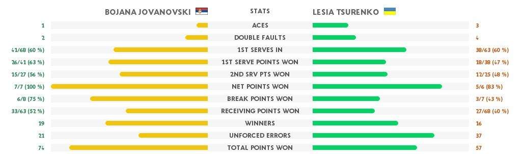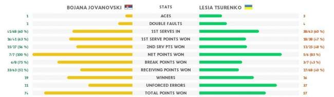 И в решающей партии сербка продолжила свою беспроигрышную серию. Возможность взять хотя бы один гейм на подаче соперница Цуренко получает в четвертом гейме, но Йовановски успешно сохраняет брейкпоинты.