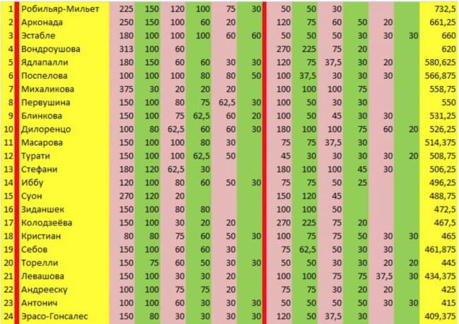 За тот отрезок времени, который прошёл с предыдущего GA, среди участников Гонки наметились изменения. У Вондроушовой четвёртое место может послужить удобным трамплином на самый верх. Вот только для этого нужно успешно сыграть и на Ролан-Гарросе. Пятое место Пранджалы Ядлапалли может послужить авансом, ведь на грунте индийская теннисистка уж точно не фаворит. И раз уж я заговорила о фаворитах, то кто, по-вашему, может победить в Париже? Я специально для показа оставила в Гонке только 25 человек. Без венгерок, австралиек и китаянок. США здесь представлены лишь Арконадой. А победа на Ролан-Гарросе кого-нибудь из нынешних лидеров гонки обеспечит этому самому лидеру уж очень комфортное положение перед второй частью сезона в борьбе за чемпионский титул по итогам года.