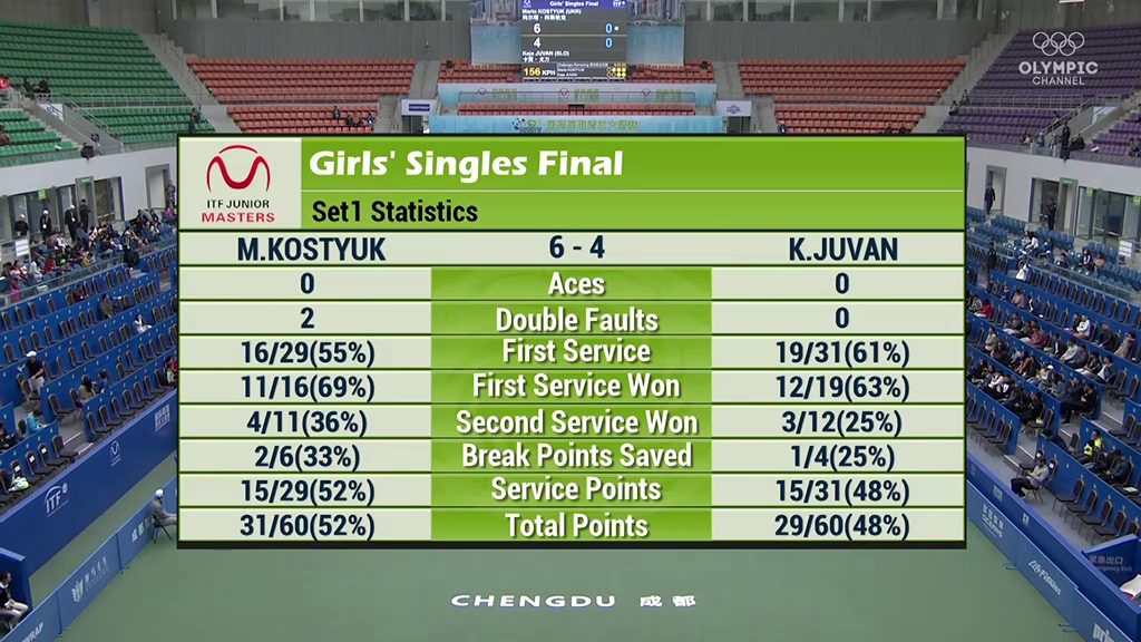 Начала матч украинка не очень удачно, проиграв два гейма на своей подаче, но сделалаодин брейк, что не давало словенке уйти в большой отрыв. Второй брейк Марта вернула в восьмом гейме, отыгравшись со счёта 2:4, затем взяла свою подачу и впервые вышла вперёд 5:4, а на подаче соперницы в следующем гейме украинка реализовала первый же сетбол.