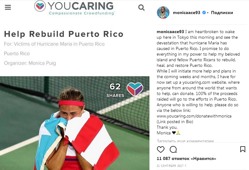 После урагана «Ирма» в сентябре я стала писать название своей страны на задней части своей теннисной обуви, и буду продолжать это делать, чтобы Пуэрто-Рико всегда был со мной на каждом матче и каждом турнире. Пуэрто-Рико всегда будет в моём сердце и всегда будет со мной на корте, где бы я не находилась. Все говорят, когда я играю ради Пуэрто-Рико, я показываю вдохновлённый теннис.