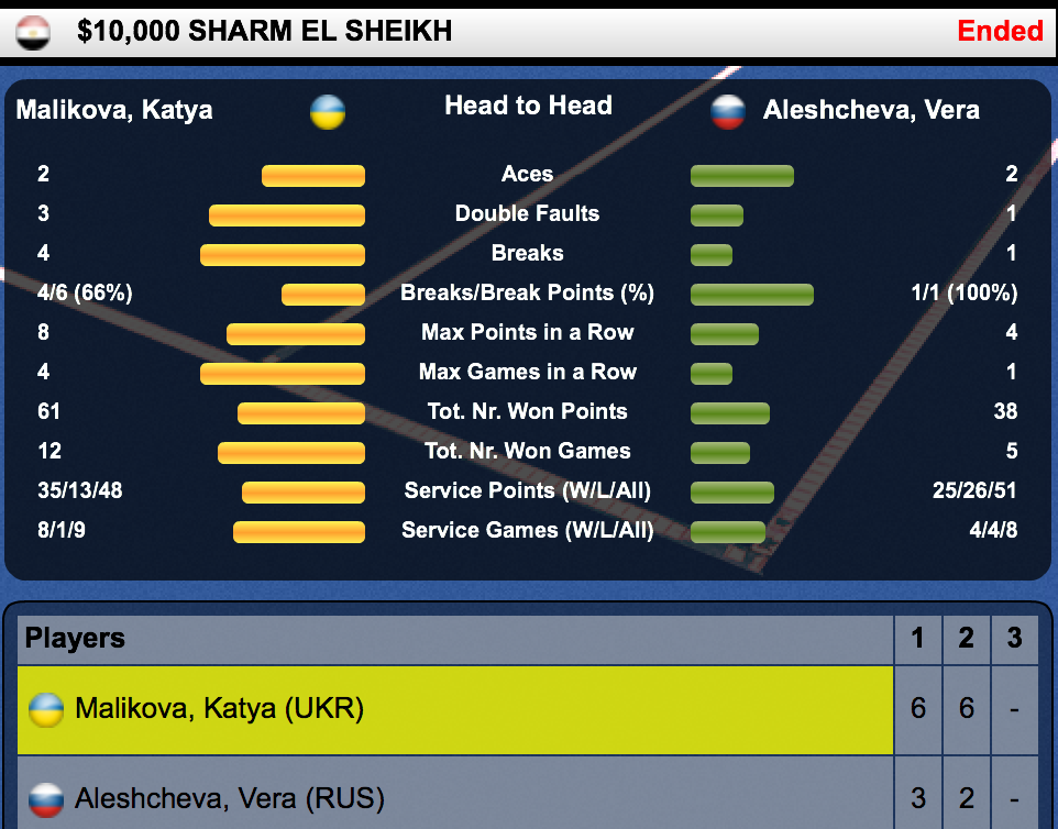 Катя Маликова (Украина, 6) — Вера Алешчева (Россия) 6-3 6-2