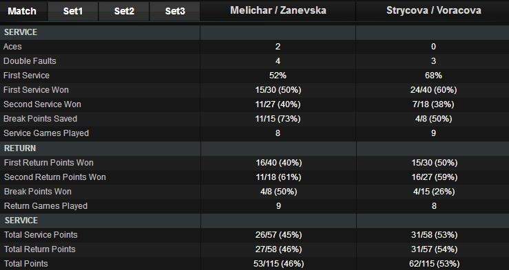 Марина Заневская (Украина) / Николь Меличар (США) — Барбора Стрыкова (Чехия, 2) / Рената Ворацова (Чехия, 2) 6:3, 2:6, 4:10