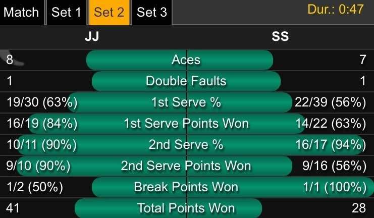 Борьба во втором сете была более напряженной. До счета 5:5 теннисисты защищали свои геймы. Первый брейк сделал Стаховский, но подать на сет не смог. Уже на тайбрейке Янович повел 2:2, хотя украинец смог восстановить равновесие — 3:3. Следующие четыре очка подряд берет поляк и записывает в свой актив еще одну партию.