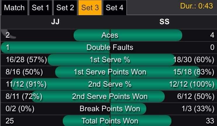 При счете 3:2 украинец берет подачу соперника в третьей партии. Свое преимущество Стаховский не уступает до конца сета и переводит игру в четвертую партию.