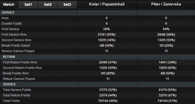 Марина Заневская (Украина) / Катажина Питер (Польша) — Настя Колар (Словения) / Деспина Папамихаил (Греция) 6:4, 5:7, 10:6