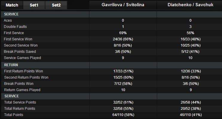 Дуэт Свитолиной и Гавриловой уверенно начал полуфинальный поединок, поведя в счете 3:1. Доведя сет до победы, Элина и Дарья продолжили наращивать преимущество уже и во второй партии. Но другой украино-российский дуэт Савчук и Дьяченко смогли установить равенство в сете (3:3). Только при счете 6:5 Свитолина и Гаврилова смогли воспользоваться матчболами и завершить встречу в свою пользу.