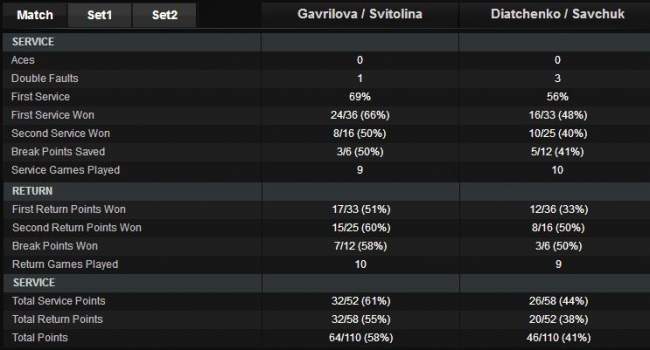 Элина Свитолина (Украина, ALT) / Дарья Гаврилова (Россия, ALT) — Ольга Савчук (Украина, 4) / Виталия Дьяченко (Россия, 4) 6-1 7-5