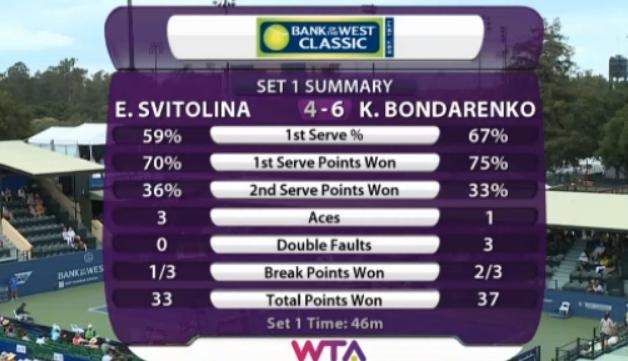 После небольшой паузы из-за дождя Элина эйсом сравнивает счет в сете — 3:3. Интрига появляется на подаче Катерины при счете «ровно», но Бондаренко эйсом и еще одной хорошей подачей вновь выходит вперед в партии. С 40:15 (4:5) сравнялся счет на подаче Свитолиной. Катерина выходит к сетке, а Элине не удается обвести соперницу. Она отправляет мяч в аут — сетбол для Бондаренко. В обмене ударами на задней линии ошибается Свитолина и стартовый сет уходит в актив Катерины Бондаренко.
