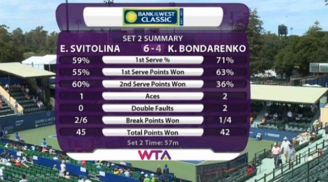 Уверенно берет первое очко во второй партии Катерина и навязывает борьбу уже на подаче Свитолиной — счет доходит до «ровно», но Элина не позволяет сопернице заработать брейкпоинты. А теперь уже проблемы на подаче у Бондаренко, когда соперница получает шанс сделать брейк (30:40). Но точная и активная игра Катерины вновь приносит плоды — 2:1 в пользу Бондаренко. Теперь уже Свитолиной приходится спасать ситуацию, отыгрывая брейкпоинты — 2:2.