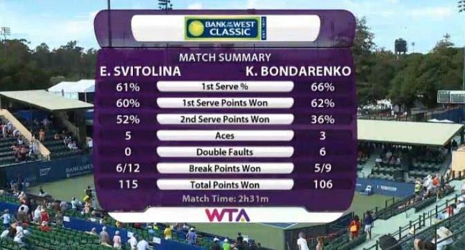 При счете 5:3 Катерина подает на матч. Теперь уже тройной брейкпоинт зарабатывает Свитолина и успешно реализует — 5:4 и украинское дерби в Стэнфорде продолжается. Ни одного розыгрыша не отдает Элина — 5:5. Беспроигрышная серия Свитолиной продолжается, когда теннисистка под ноль делает очередной брейк в партии. Теперь на матч будет подавать Элина. С двойного матчбола восьмая сеяная оформляет победу и проходит во второй раунд турнира в Стэнфорде. Напомним, что Катерина Бондаренко пробилась в основную сетку соревнований из квалификации.