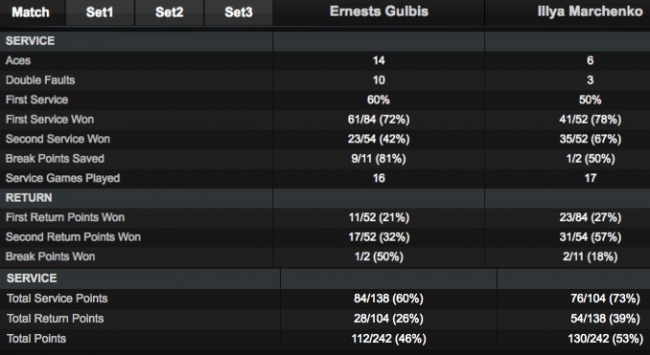 Илья Марченко (Украина) — Эрнест Гулбис (Латвия, 3WC) 6-3 6-7(5) 7-6(2)