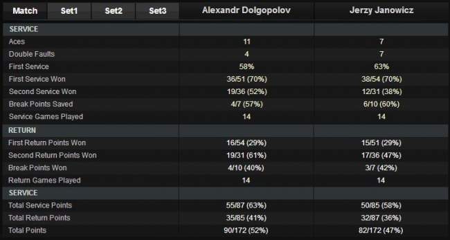 Первый сет проходил при равной борьбе, пока украинец не сделал брейк при счете 4-3 и в следующем гейме успешно подал на победу в партии. Далее игра развивалась совсем по другому сценарию. Янович уверенно захватил инициативу — свой первый гейм в сете Долгополов выиграл только при 0-5. В концовке партии Александр смог сделать обратный брейк, но этот сет все равно ушел в актив польского теннисиста — 6-3.