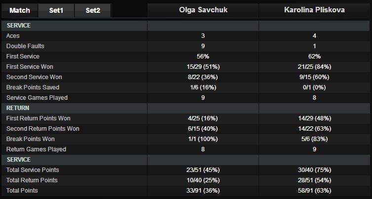Ольга Савчук (Украина, Q) — Каролина Плишкова (Чехия, 5) 4-6 1-6