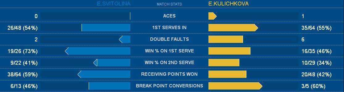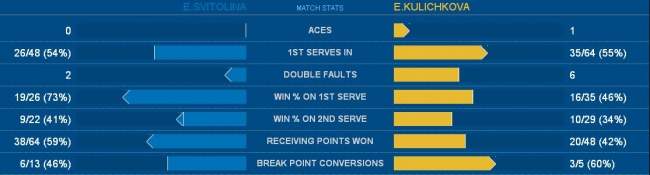 Матч так и продолжался при полном доминирования харьковчанки (3-0). Дебютный гейм во второй партии Куличкова также выигрывает на подаче соперницы. Дальше игра развивалась по тому же сценарию, что и в предыдущей партии: Свитолина сразу же делает еще один брейк, не давая россиянке сократить свое отставание. Елизавета выигрывает второй гейм в сете и при счете 5-2 Элина подает на матч. Но взять шестое очко у нашей теннисистки не получается — «под ноль» берет гейм Куличкова. Завершить поединок Свитолина смогла со второй попытки — 6-4.