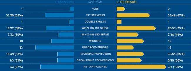 При счете 2-2 в первой партии украинка заработала тройной брейкпоинт и успешно его реализовала. Так же, «под ноль», Цуренко выиграла гейм на своей подаче и укрепила преимущество в сете. Второй брейк оформила Леся и вышла подавать при 5-2. Завершить партию второй ракетке Украины сразу не удалось — Шафаржова делает обратный брейк. Но со второй попытки Цуренко успешно записывает сет в свой актив.