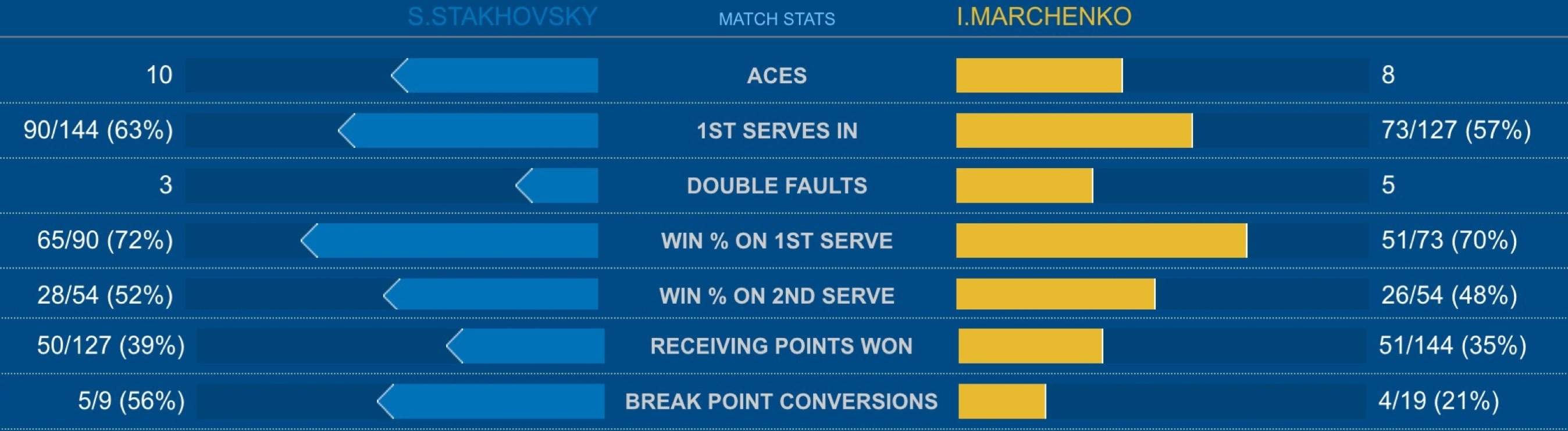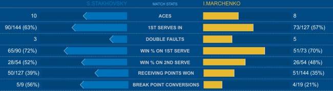 Украинское противостояние прошло в равной борьбе. В первой партии, Стаховскому удалось, отыграв три брейк-пойнта в стартовом гейме, сделать брейк на первой же подаче Марченко. Илья вернул подачу в седьмом гейме, но при счете 4-5 в упорной борьбе все же проиграл свой гейм еще раз и первый сет остался за Стаховским.