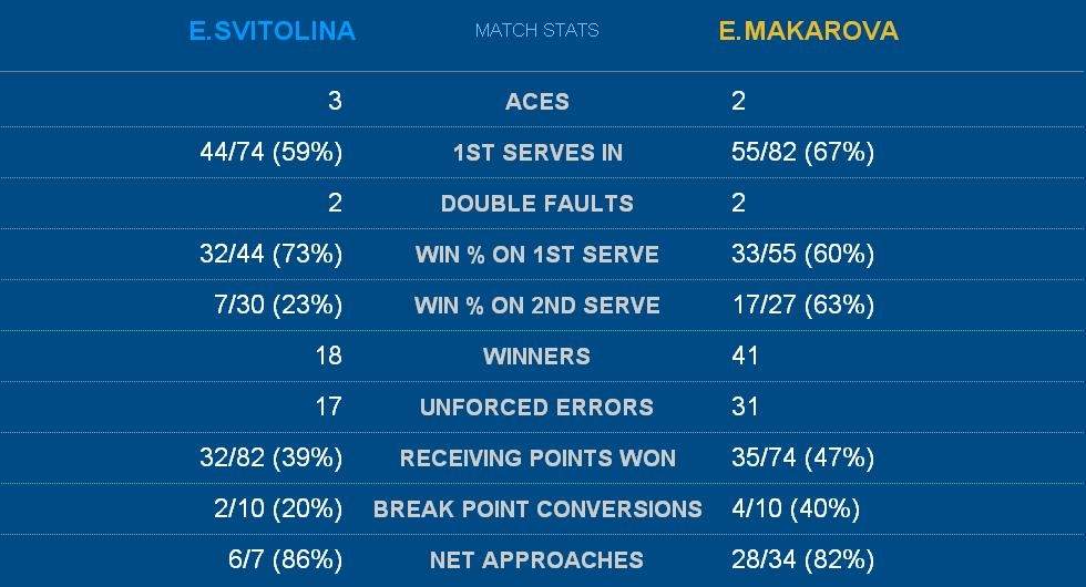 В первом же гейме украинка сделала брейк, но закрепить преимущество не смогла. Макарова берет сразу два брейка подряд, активно действуя на приеме второй подачи, а дальше доводит сет до победы. По итогам первой партии Свитолина выиграла только 8% розыгрышей на своей подаче вторым мячом.