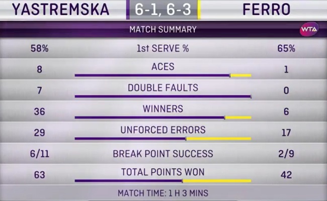 Для победы над 88-й ракеткой мира Ястремской потребовалось чуть больше часа. Во втором сете Даяна не подала на матч при счете 5-1, а завершить встречу украинка уже в девятом гейме, реализовав свой пятый матчбол.