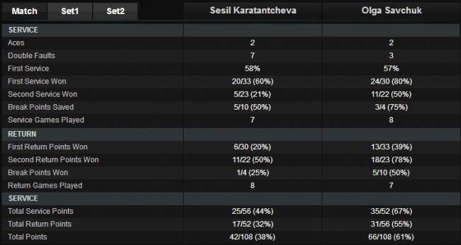 Ольга Савчук (Украина) — Сесиль Каратанчева (Болгария, 4) 6-1 6-2