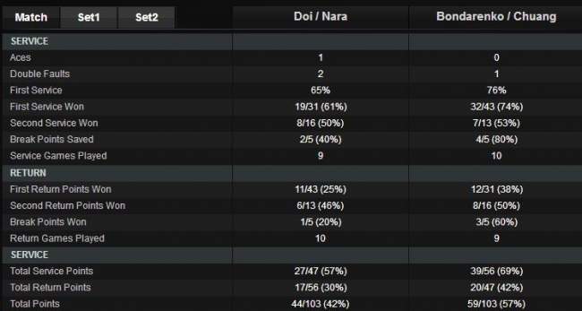 Катерина Бондаренко (Украина) / Чуан Чиа-Цзюн (Тайвань) — Мисаки Дои (Япония) / Куруми Нара (Япония) 6-3 6-4