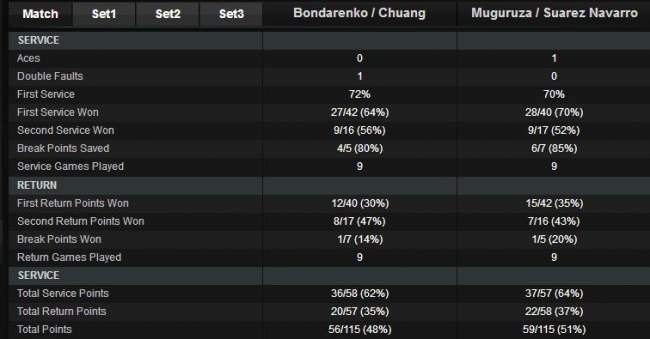 Катерина Бондаренко (Украина) / Чуан Чиа-Цзюн (Тайвань) — Гарбинье Мугуруса (Испания, 3) / Карла Суарес-Наварро (Испания, 3) 6-3 3-6 5-10