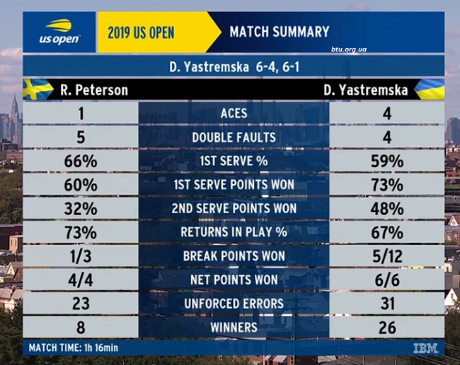 Девушки провели на корте 1 час и 15 минут. Ястремская записала на свой счет 5 брейков, а на своей подаче проиграла один гейм.