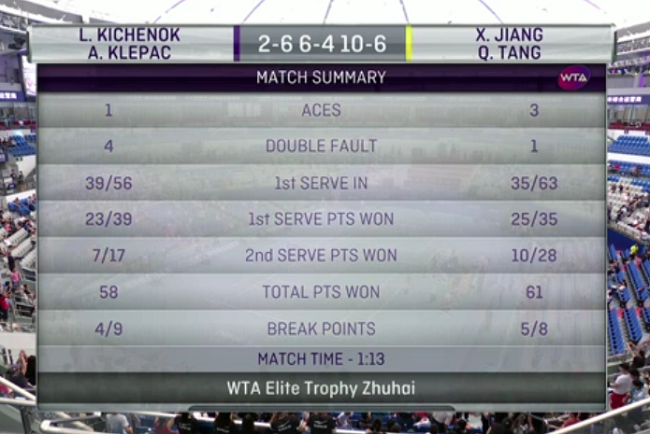 Теннисистки провели на корте 1 час и 13 минут. Киченок и Клепач за матч проиграли 5 геймов на своей подаче и оформили 4 брейка. На решающем тай-брейке украинка и словенка выполнили 4 мини-брейка, а их соперницы — только 2.