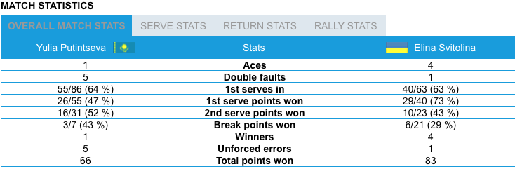 За 1 час 39 минут, 20-летняя украинская теннисистка, занимающая 26-е место в рейтинге WTA, со счетом 6-3 7-5 переиграла свою ровесницу из Казахстана Юлию Путинцеву, которая располагается на 114-й строке мирового рейтинга. За время поединка Свитолина четыре раза подала навылет, допустила одну двойную ошибку и реализовала шесть брейк-пойнтов из двадцати одного. Это первая победа Элины над Путинцевой в третьей из личной встрече.