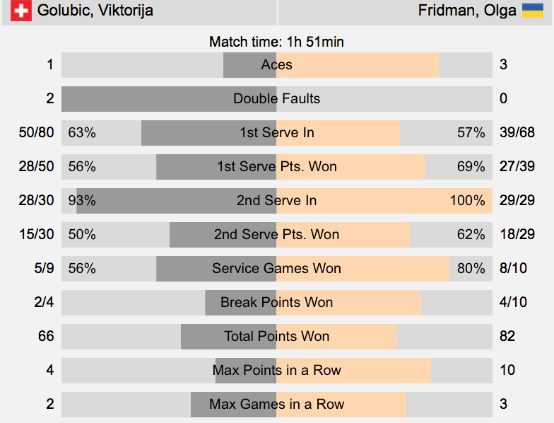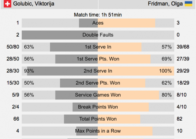 Ольга Фридман (Украина, Q) — Виктория Голубич (Швейцария, 7) 6-2 7-6(5)