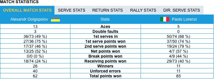 За полтора часа, проведенные на корте, Долгополов не заработал ни одного брейк-пойнта и уступил в четырёх геймах на своей подаче. На помогли Саше 13 эйсов при 3 двойных ошибках. Лоренци подал навылет 5 раз.