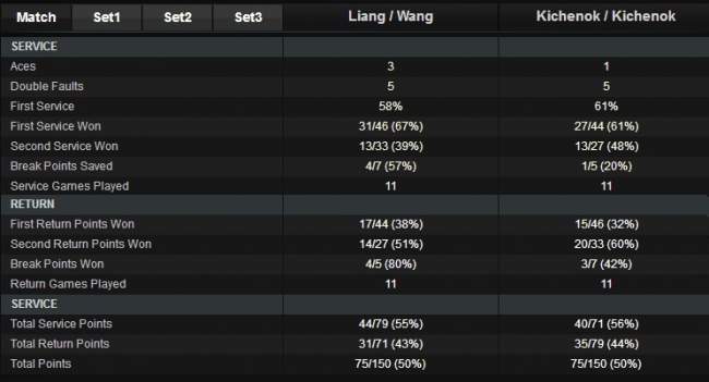Людмила Киченок (Украина, 5) / Надежда Киченок (Украина, 5) — Чен Лянь (Китай, 4) / Ван Яфань (Китай, 4) 7-6 (3) 4-6 6-10