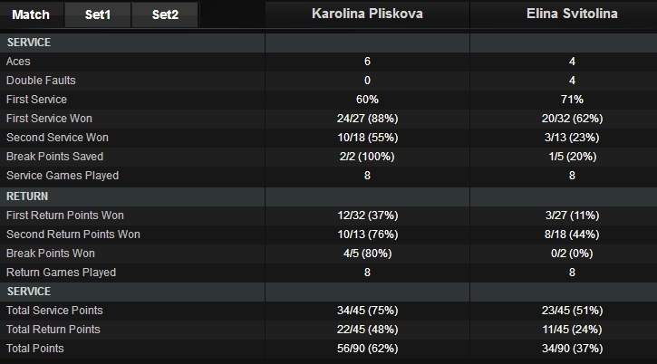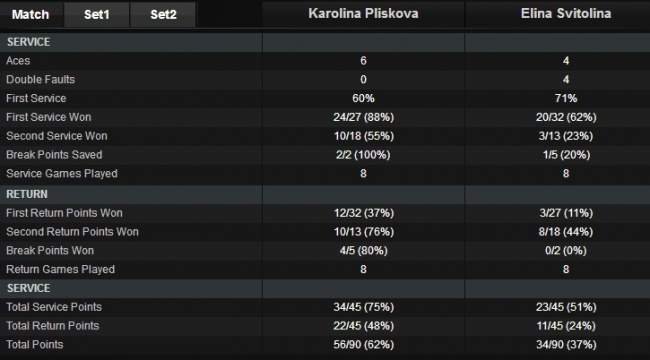 После вчерашнего марафона против Карлы Суарес Наварро побороться на равных с Каролиной Плишковой у нашей теннисистки не получилось. Чешка уверенно действовала на своих геймах, выиграв 24 из 27 розыгрышей на подаче первым мячом и 10 из 18 на втором. Свитолина взяла 20 из 32 очков при попадании первой подачи и только 3 из 13 на втором мяче.