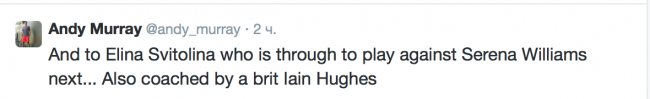 «Отлично сыграла Элина Свитолина, которой теперь предстоит помериться силами с Сереной Уильямс… Её, кстати, тренирует британец Ян Хьюз», — написал Маррей.