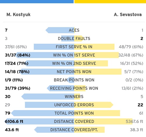 Матч продолжался 1 час и 20 минут. Для победы в первом сете Костюк хватило одного брейка, а на тай-брейке второй партии Марта взяла 5 очков подряд, уступая 2-5.