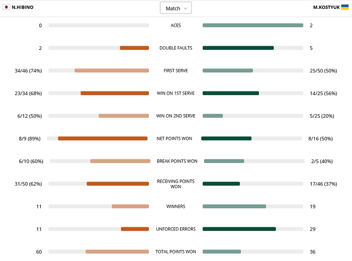 Теннисистки провели на корте около часа. В первом сете Костюк, уступая 1-3, сравняла счет, но дальше до конца поединка выиграла только один гейм. Марта реализовала 2 из 5 шансов на брейк, а её соперница — 6 из 10.