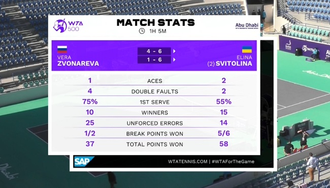 Just over an hour ⏱️@ElinaSvitolina defeats Zvonareva, 6-4, 6-1.#AbuDhabiWTA pic.twitter.com/I8y8DDqi9g