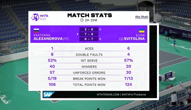 Свитолина оформила 7 брейкпоинтов из 13, выполнила 20 виннеров при 30 невынужденных ошибках. Александрова записала на свой счет 5 брейков при 19 брейкпоинтах, 40 виннеров и 57 невынужденных ошибок.