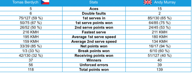 На счету Энди пятнадцать подач навылет и две двойные ошибки, Бердых в свою очередь выполнил пять эйсов и шесть раз ошибся при подаче. Британец сумел сделать шесть брейков, на что чешский теннисист ответил лишь одним. Таким образом, Маррей сократил отставание в личных встречах — теперь он уступает 5-6.