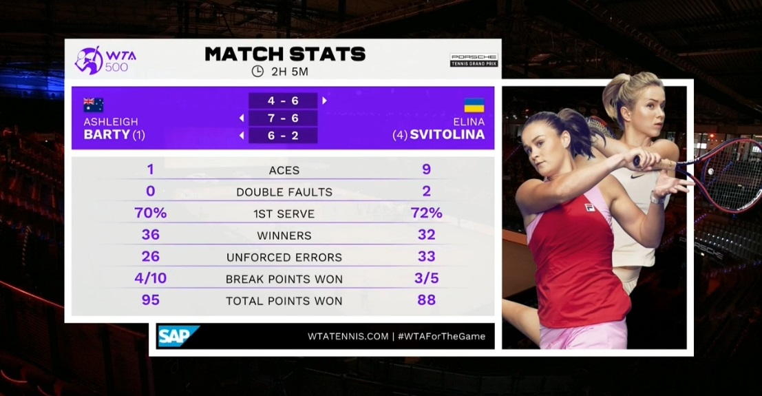 Теннисистки провели на корте чуть более 2 часов. Судьбу первого сета решил один брейк. Во второй партии со счета 1-4 Свитолина выиграла четыре гейма подряд, после чего не подала на победу в десятом гейме. На тай-брейке украинка лидировала 4-2, а дальше Барти записала в свой актив 5 из следующих 6 очков. В решающем сете Свитолина проиграла два гейма на подаче и не заработала ни одного брейкпоинта.